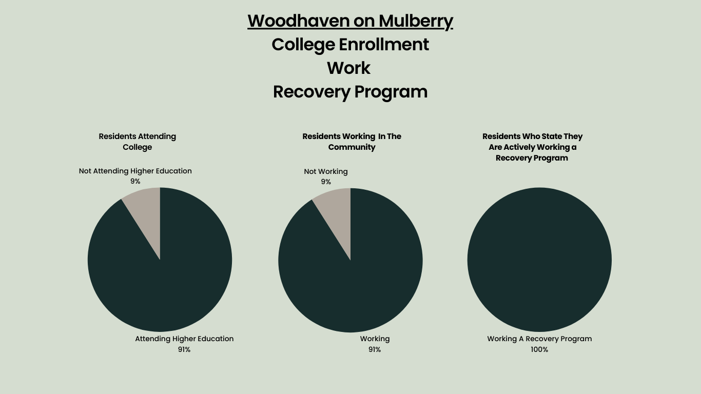 Woodhaven Recovery is proud of our residents and alumni, whose commitment to sobriety and personal growth is reflected in these outcomes. This data highlights the positive impact of our individualized, supportive approach to recovery and education. Each young person at Woodhaven Recovery receives personalized care to help them build a fulfilling, sustainable life beyond substance use. The achievements of our residents—academically, vocationally, and personally—underscore the success of our integrated programs in fostering long-term sobriety and meaningful community involvement.